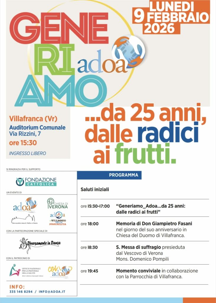 Con la presente si invita la S.V. all'evento "Generamo ADOA….da 25 anni... dalle radici ai frutti" dalle ore 15:30 presso l'Auditorium Comunale in Via Rizzini 7 a Villafranca di Verona, al quale seguirà S. Messa di suffragio nel giorno dell'anniversario della morte di Mons. Giampietro Fasani dalle 18:30 presso la Chiesa del Duomo.